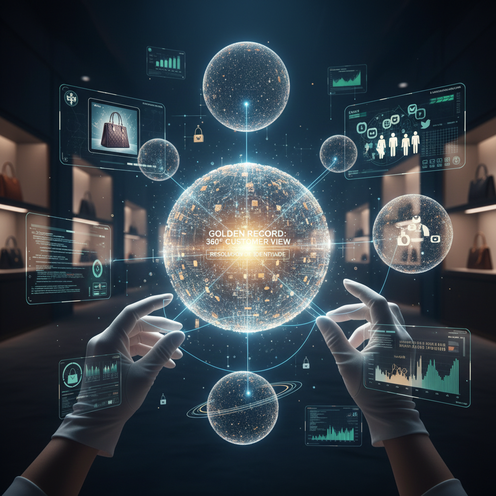 •O Objetivo Final: A Resolução de Identidade. Costurar os fragmentos do comportamento do cliente através de múltiplos dispositivos para que a mulher que admira uma bolsa em seu tablet seja instantaneamente reconhecida como a mesma colecionadora que adentra sua loja em Milão.